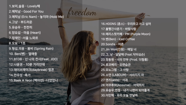 1 .보미,슬옹 - Lovely해 0:00 2 .에릭남 - Good For You 3:07 3 .에릭남 (Eric Nam) - 놓지마 (Hold Me) 6:22 4 .그냥 - 부드러운 10:09 5 .유승우 - 천천히 14:06 6 .양요섭 - 마음 (Heart) 17:41 7 .장재인 -서울 느와르 21:18 8 .오묘 - 1초 24:46 9 .형섭,의웅 - 봄비 (Spring Rain) 27:49 10 . Ben(벤) - 열애중 31:23 11 .BTOB - 넌 나의 천사(Feat. JOO) 35:53 12 .나윤권 - 10분 거리인데 39:52 13 .데이브레이크(daybreak) 팝콘 43:43 14 .전우성 -축가 47:43 15 .Baek A Yeon (백아연) -너였었니 52:02 16 .HOONS (훈스) – 우리라고 쓰고 싶어 56:28 17 .볼빨간사춘기 - 바람사람 59:54 18 .메리스윗카페 - PM (Purple Moon) 1:03:31 19 .벤(Ben) - Iced Coffee 1:06:53 20 .Sondia - 어른 1:10:30 21 .Jin Won(진원) - 매일 너 1:14:50 22 .그_냥 - 달달해 (Feat.닥터심슨) 1:19:23 23 .정동원 - 너의 안부 (Prod. 더필름) 1:23:07 24 .로코베리 - 오랜습관 1:26:52 25 .모노그램 - 그 사람 1:30:04 26 .소연 (LABOUM) - 사라지지 마 1:33:40 27 .앤츠(ants) - 사과 1:38:00 28 .어쿠루브(Acourve) - 어떡하지 1:41:35 29 .유승우,연정 - 내가 니편이 되어줄게 1:45:00 30 .이민혁 - 우리 오늘 만날까 1:48:43